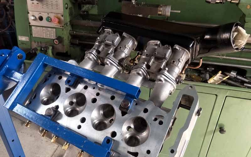 The cylinder head rig was employed to make sure that the weber carbs fitted correctly onto the manifold studs, and on the exhaust side of the head, the extractors were trial fitted to make sure there were no snagging of manifold flanges onto the head studs. This kind of work is far easier to check and correct rather than wait until everything is installed back into the car.